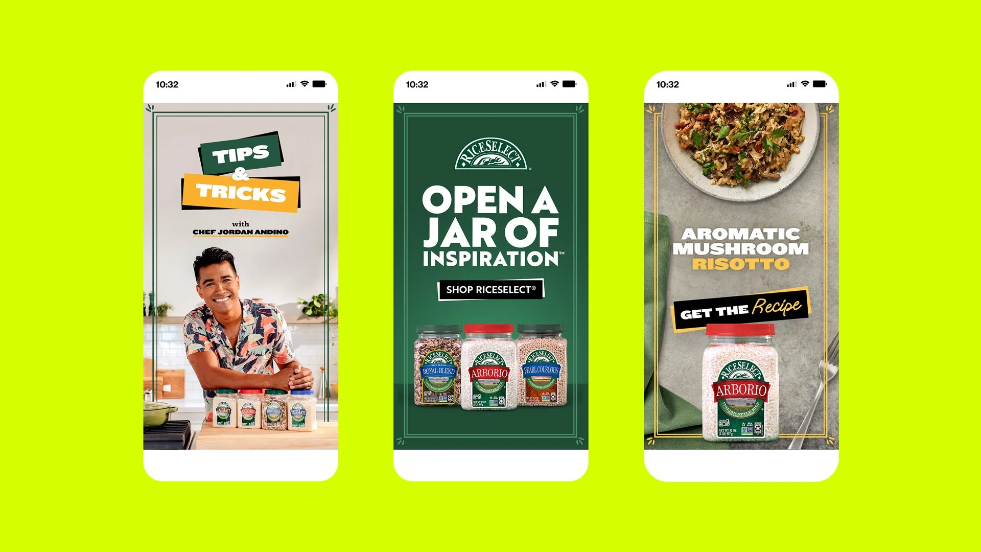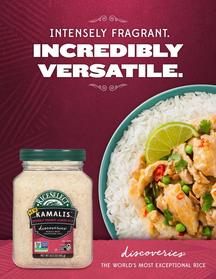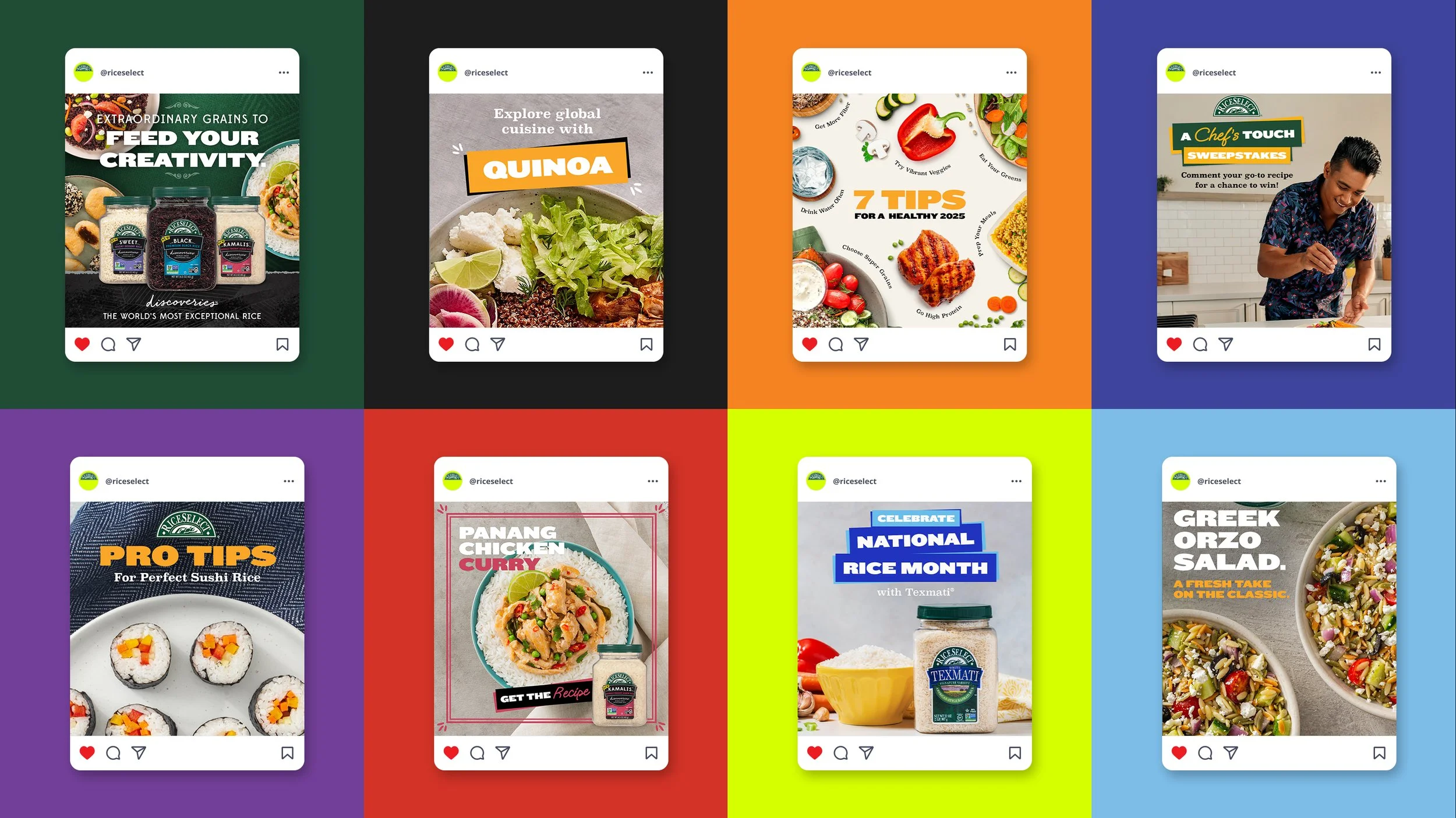 Production of on-brand social feed content integrating key product highlights, seasonal recipe ideas and influencer content into strategic weekly posts for the RiceSelect line of products.